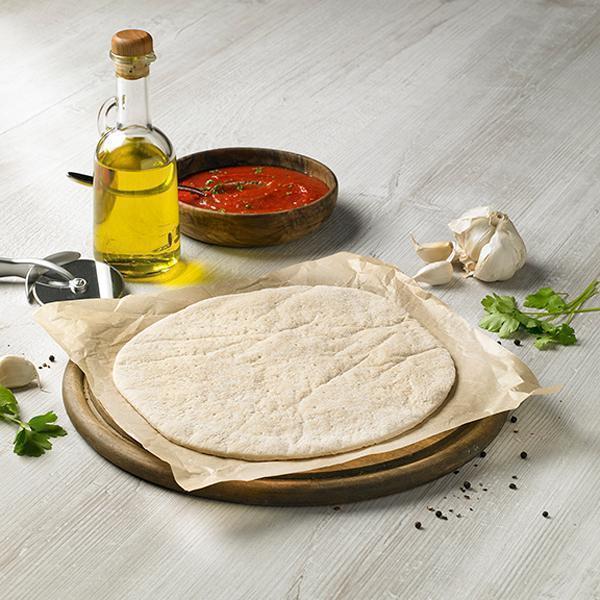 Thin and crispy pizza base made with wheat flour.