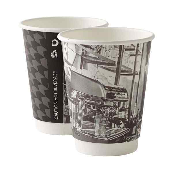 DISPO MIXED 12oz DOUBLE WALL PAPER CUPS 1x500 Two simple designs, black dominant ( 52012 ) Suitable lids are - GFC150 & GFC022