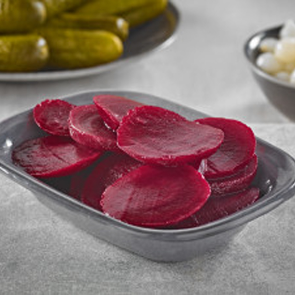 Appearance: Cooked, peeled, and sliced beetroot in vinegar