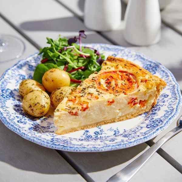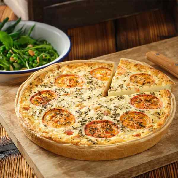 Experience a slice of Italy with our authentic Tomato and Basil Quiche. Set in a shortcrust pastry, this vegetarian dream contains a rich blend of pasteurised eggs, mature Cheddar cheese, onions, and tomatoes. A hint of basil completes this classic Italian combination.