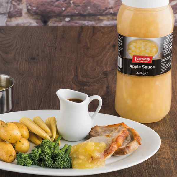A straw coloured sauce with discernible apple chunks. Sweet apple flavour.