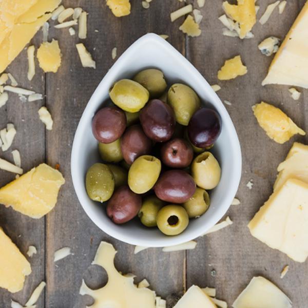 A mix of pitted green and black olives, marinated with vegetables, herbs, and spices.
