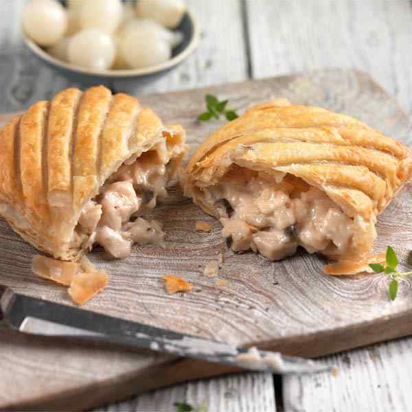 A Machine made puff pastry slice, with a HALAL chicken and mushroom filling. Product is glazed, baked, frozen and distributed.