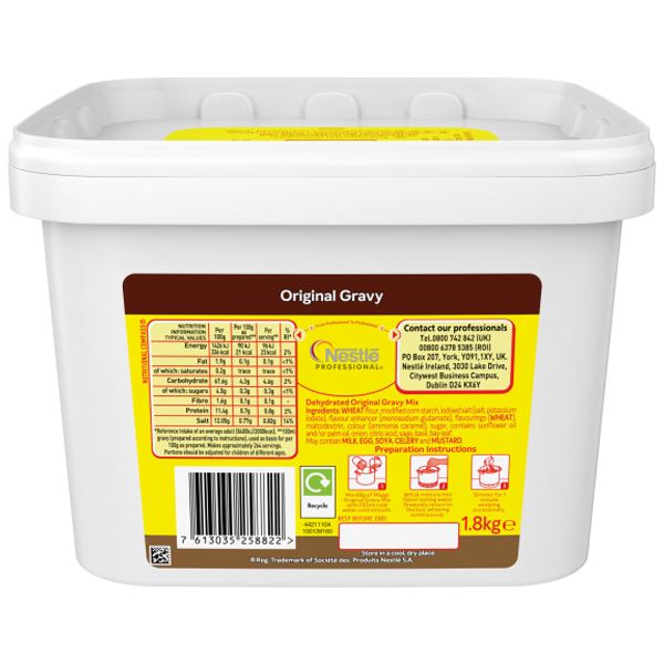 Dehydrated Original Gravy Mix (contains Wheat Flour), Palm Fat, Maltodextrin, Salt, Flavour Enhancers (Monosodium Glutamate), Yeast Extract, Vegetable Protein, Onion Powder, Colour (E150c – Ammonia Caramel)