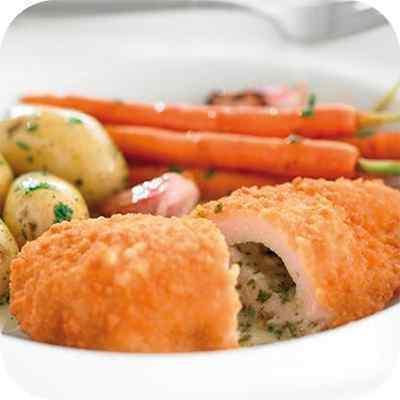 Product Description: Chopped and shaped chicken with a buttery garlic filling in a crispy breadcrumb coating.