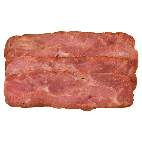 Visual appearance : Uniformal rectangular sliced grilled pink turkey bacon