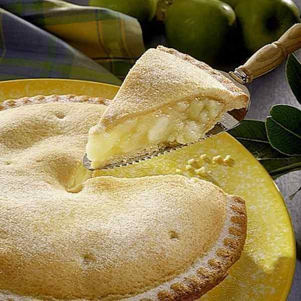A sweet short crust pastry case filled with traditional, juicy British Bramley apples with a lightly glazed pastry lid and baked until golden brown