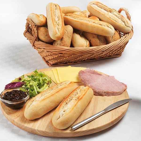 Product Description: A white, ready to serve baguette on average 280mm (approx. 11”) in length. The product has 2 decorative top cuts, is hinge sliced and is supplied frozen.