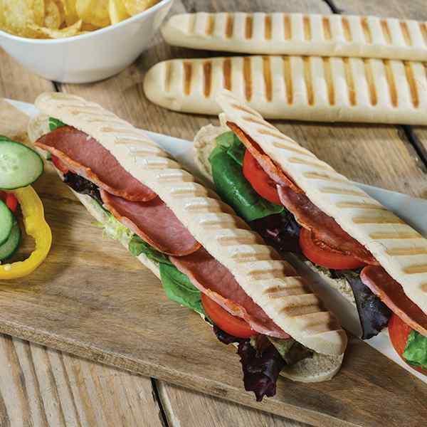 Warm grill to 250 deg C. Slice defrosted panini through - fill with required ingredients. Place top back on the panini - carefully place on double sided grill - close and toast approximately 4 minutes or until filling is hot.